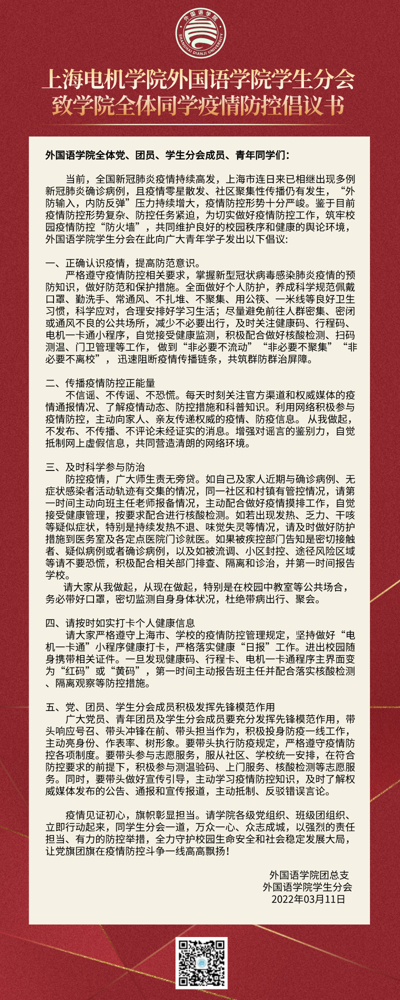 太阳成集团tyc151cc员工分会致学院全体同学疫情防控倡议书