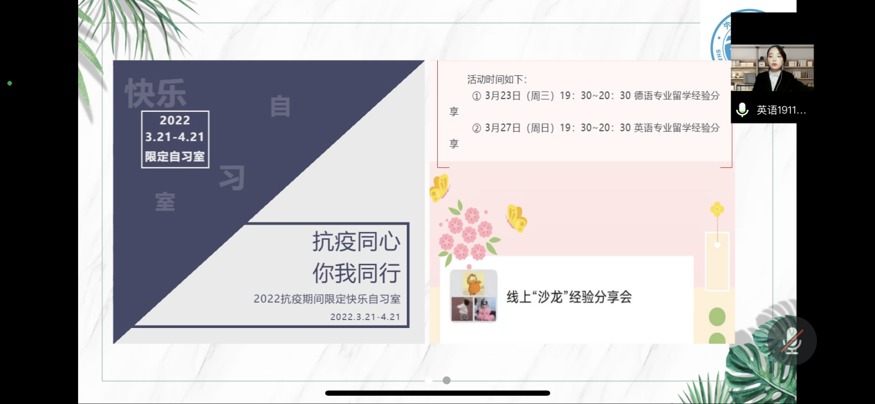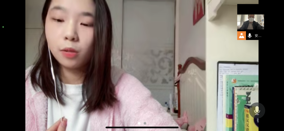 随后,来自德语1912的姚诗滢同学和德语1911的林陕江和孙清盈同学分享了疫情期间自己在德国的学习生活情况,表示自己的线上教学、生活安排都在稳步推进,但同时也表示疫情期间回国成了当前大家最大的困扰,将会时刻关注相关回国信息并严格对照入境管理规定和防控流程安排好学习生活。