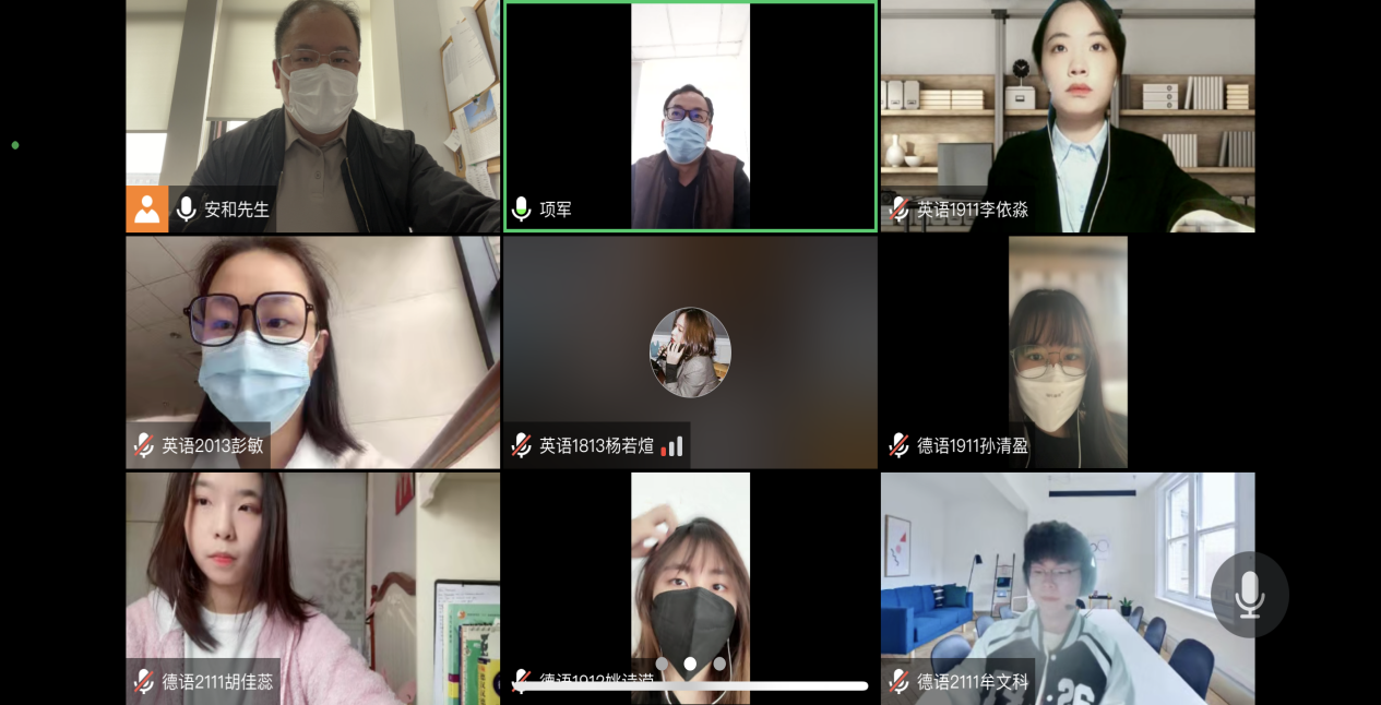 之后,校内外的同学也对自己疫情期间的生活学习进行了分享。来自德语的牟文科同学与胡佳蕊同学表示,经历过疫情,让我们更加懂得珍惜正常的生活秩序和学习机会。虽然居家隔离,生活失去了很多便利,但是却有了更多可以自我思考,自我沉淀的时间。一方面在家认真上课,积极完成员工会部门的工作,同时还不忘记加强锻炼,强健自己的体魄。