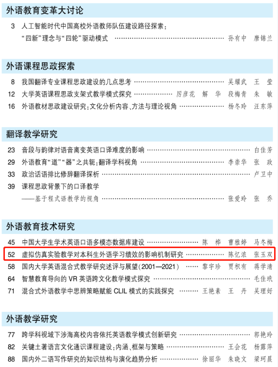 近日,太阳成集团tyc151cc张玉双教授领导的数字化外语教学团队又出新成果。陈忆浓、张玉双在《外语电化教学》(CSSCI语言学类来源期刊)发表论文“虚拟仿真实验教学对本科生外语学习绩效的影响机制研究”,总结了学院开展虚拟仿真实验教学的阶段性成果,并为虚拟仿真实验教学的开展提供了相关建议。