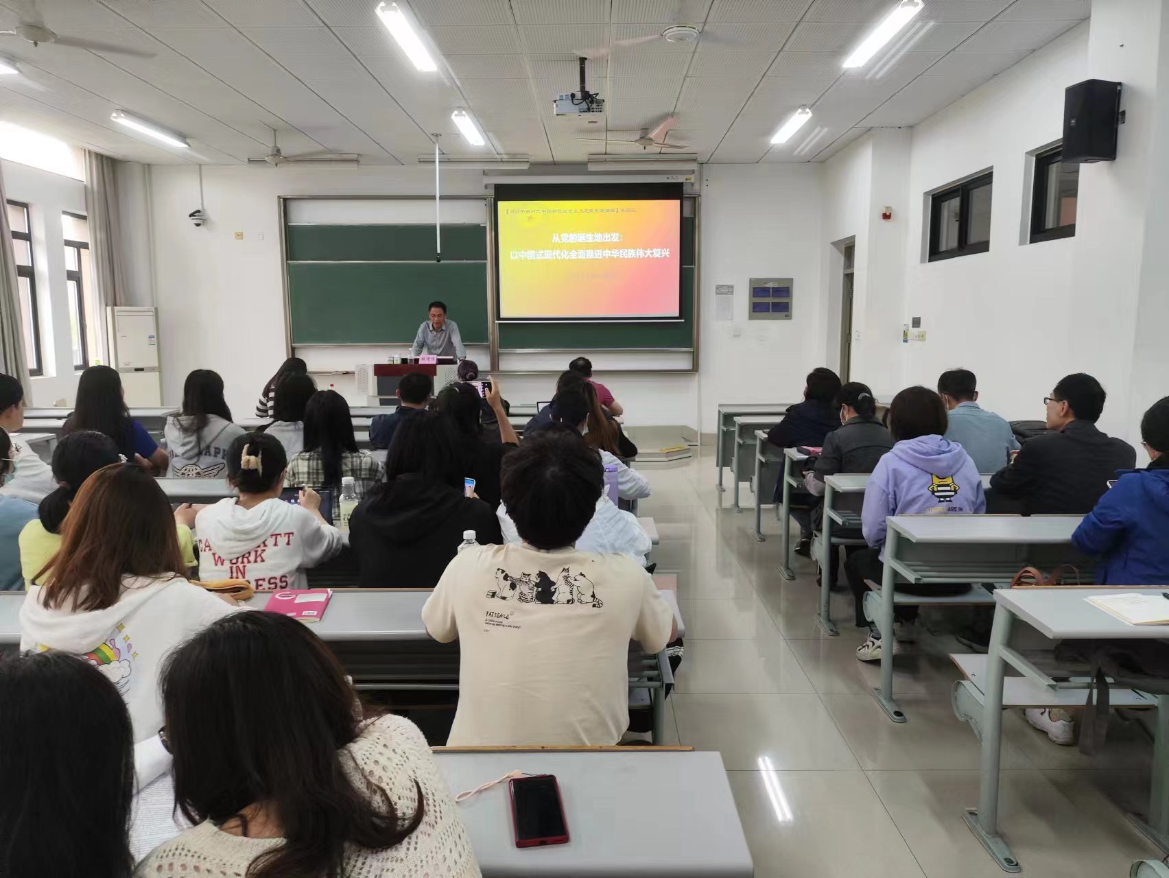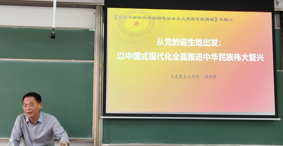为更好地讲述《以中国式现代化全面推进中华民族伟大复兴》。顾书记首先简述了此次主题教育的“总要求、根本任务、重点措施和重要意义”,呼吁党员提升“三力”,树立正确“三观”。不断增强提升自我净化、自我完善、自我革新、自我提高能力。他指出上海之所以是中国共产党的诞生地,是受经济发展程度、思想先进程度和独特地理与位置的影响。从上海出发,中国共产党通过不懈地奋斗,形成了伟大建党精神。伟大建党精神在推进中华民族伟大复兴过程中有着重要的意义。以中国式现代化全面推进中华民族伟大复兴要注意三个意味和三个维度,牢牢记住“五个坚持”重大原则。最后,顾书记引用习近平总书记在党史学习教育动员大会中的讲话,号召师生们大力发扬红色传统、传承红色基因,赓续共产党人精神血脉,始终保持革命者的大无畏奋斗精神,鼓起迈进新征程、奋进新时代的精气神。